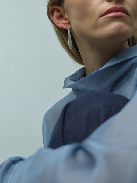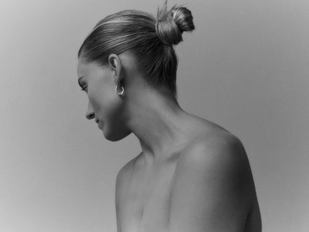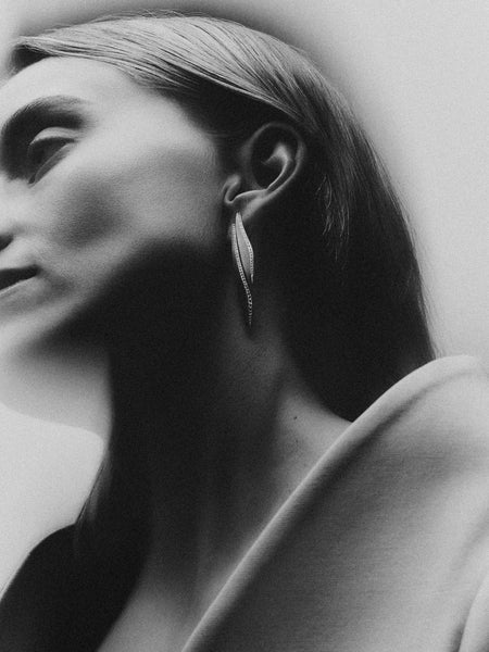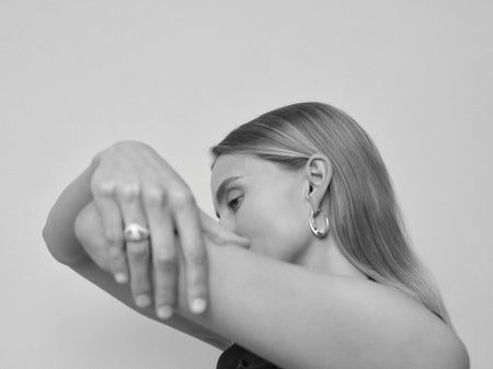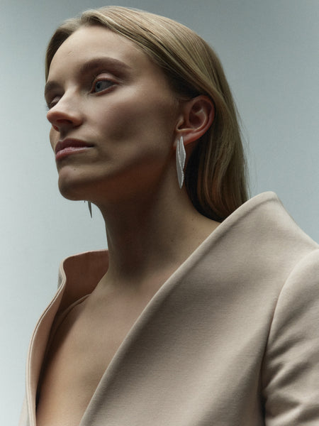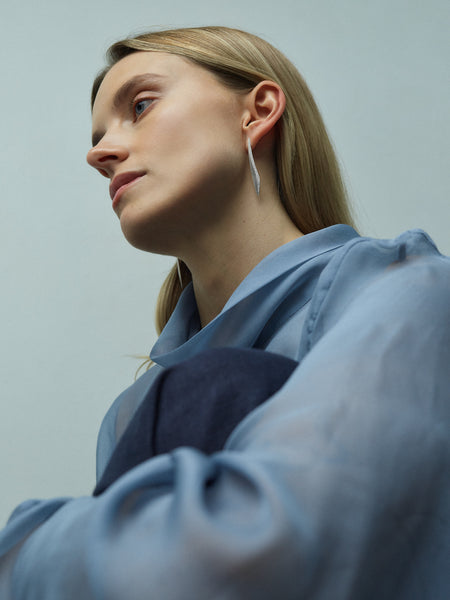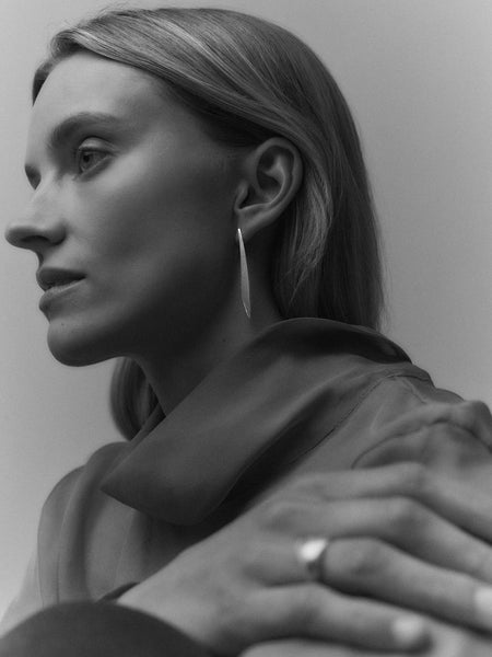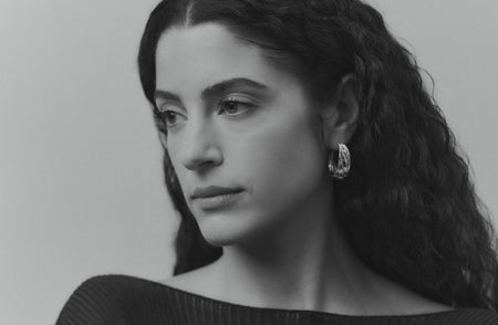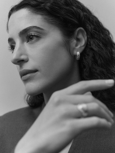 Shot within the studio of sculptor Samuel Collins, the setting reflects Hewitt’s ongoing dialogue with contemporary sculpture and her shared design principles. Collins’s ability to hold curved and angular elements in measured tension gave Hewitt the confidence to explore that same duality at jewellery scale — forming the conceptual backbone of the collection.
