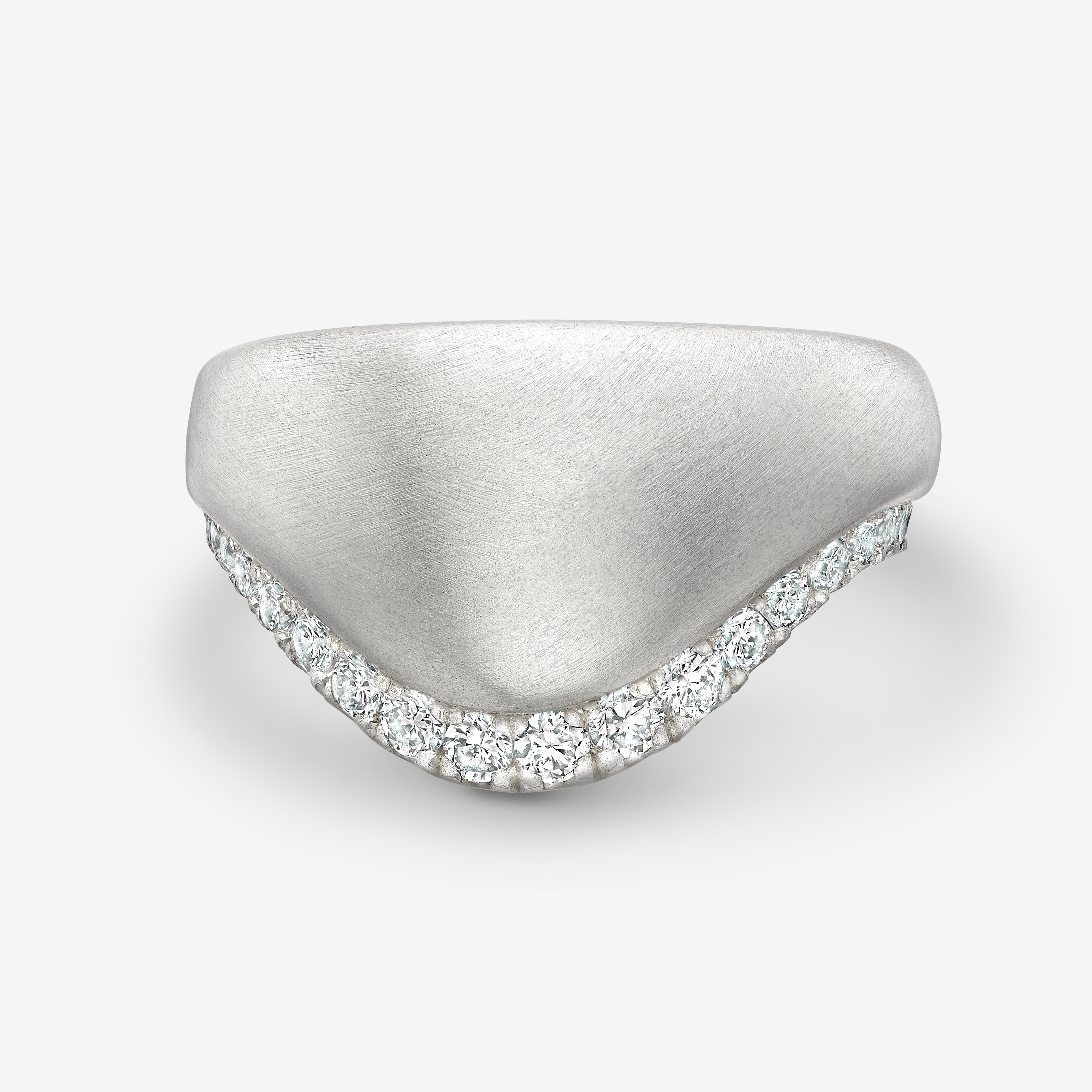 The Phase Ring is crafted from recycled 18ct gold, shaped into a smooth, curved form with a soft brushed finish. A fine line of pavé-set diamonds follows the lower contour of the ring, designed to sit comfortably for everyday wear.